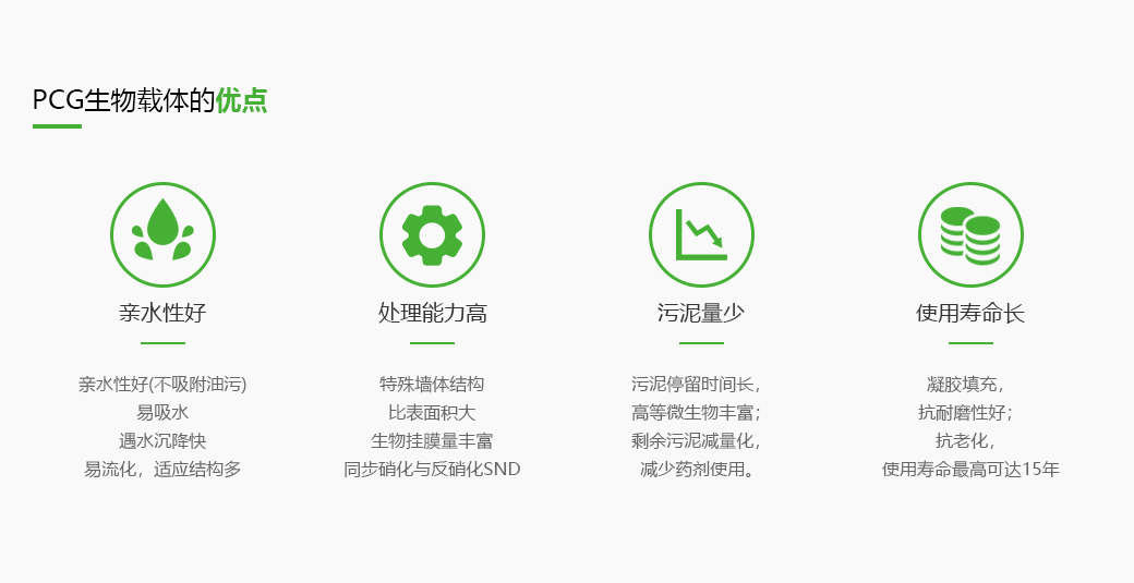 PCG是一種以高分子親水材料為基材的水處理生物載體產(chǎn)品,源自日本設(shè)計(jì)靈感,參考日本20年左右的應(yīng)用經(jīng)歷。我司技術(shù)研發(fā)團(tuán)隊(duì)從2010年開始對軟性生物載體進(jìn)行開發(fā),經(jīng)過6年的設(shè)計(jì)與開發(fā),最終選擇以高親水性,生物親和性,抗磨損性,通氣性及強(qiáng)大的比表面積的高分子新材料作為生物載體的基材,并于2016年問世。歷經(jīng)5年的小試與中試試驗(yàn),最終于2020年投入規(guī)模化生產(chǎn)。作為生物載體,PCG領(lǐng)先于國內(nèi)同類型產(chǎn)品。